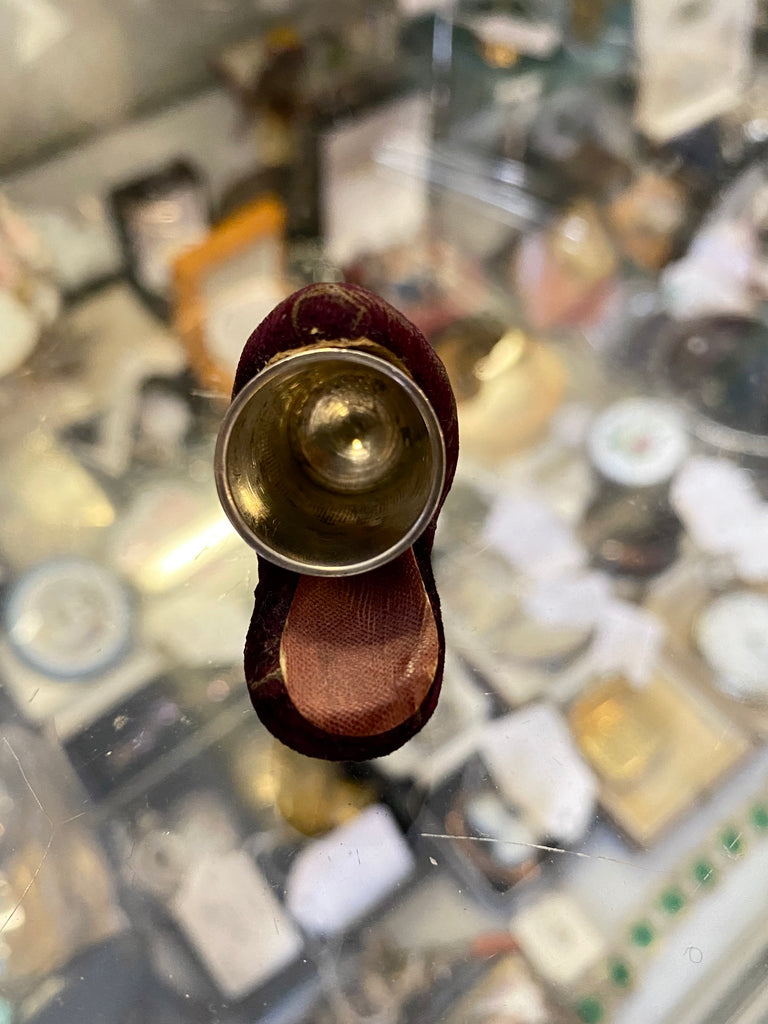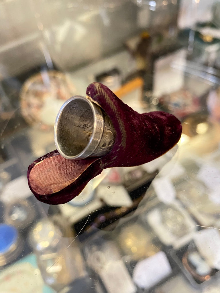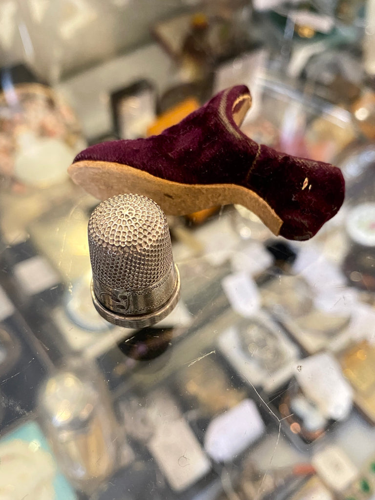 Antique 19th Century Novelty Velvet Slipper Thimble Holder & Silver Thimble