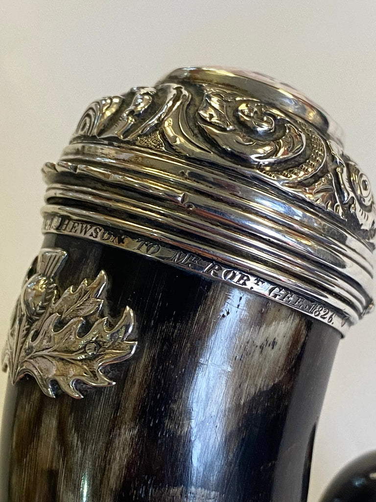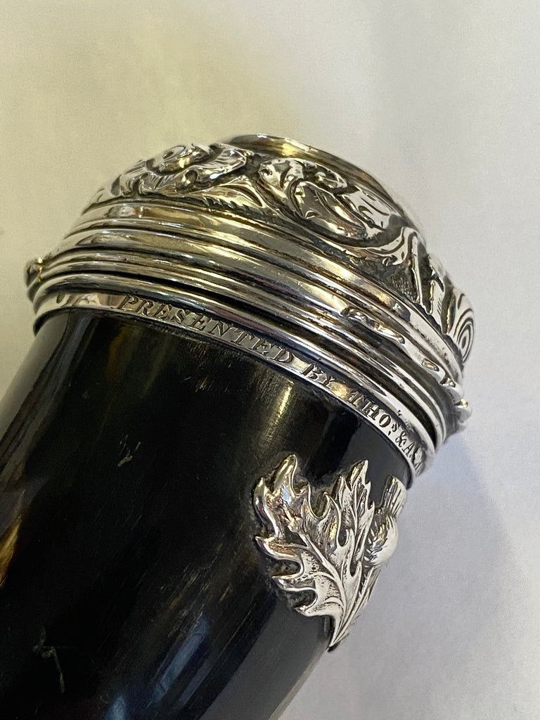 A ram’s horn, silver top + thistle with unusual pink cut stone – excellent condition
