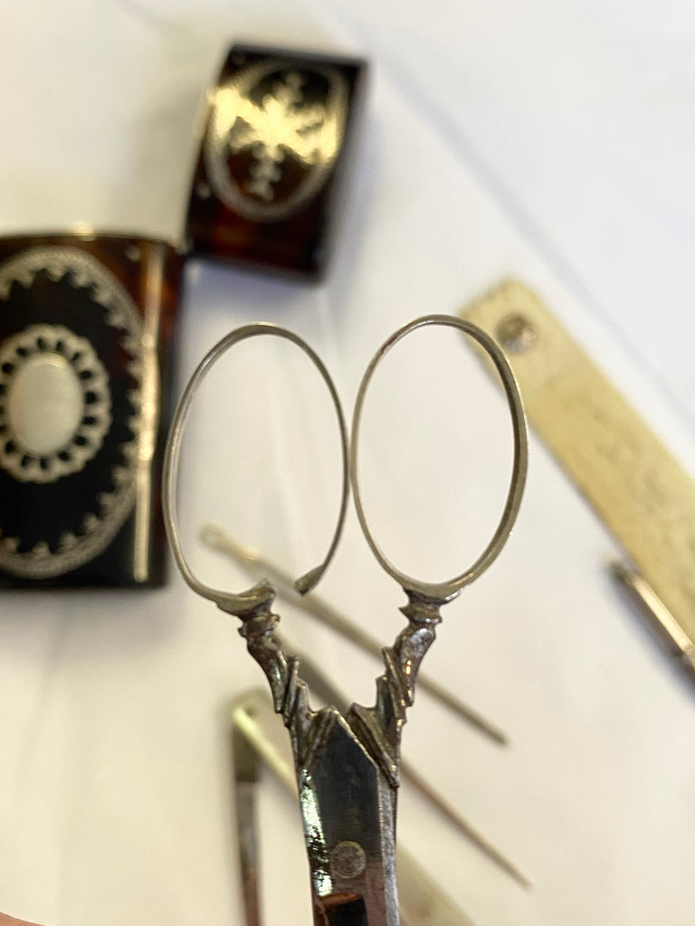 Condition is good, commensurate with age and use. Structurally sound and functions well. There’s a small loss to the bottom corner, as photographed. Some damage to the scissors.