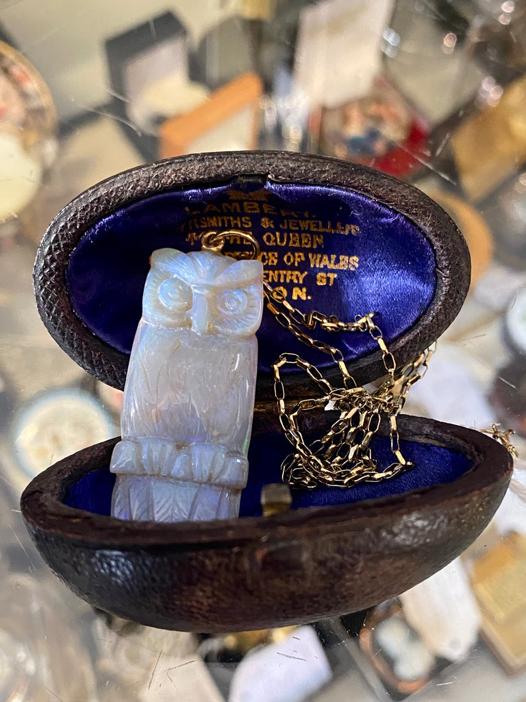 Carved Opal Owl Pendant On 9ct Gold Chain & Victorian Jewel Box