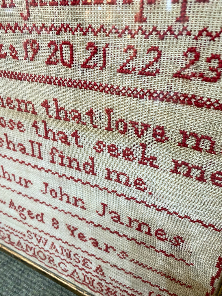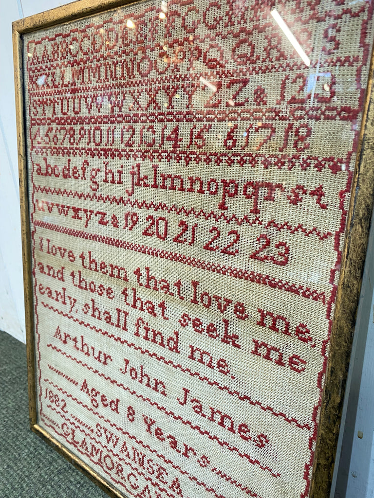 A Rare Antique 19th Century Sampler By An 8 Year Old Boy. Samplers Were Always Worked By Young Ladies, Never By Young Men. This Sampler Was Worked By An 8 Year Old Boy Arthur John James.